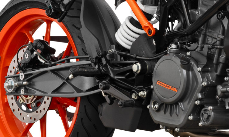 La KTM 200 Duke 2026 cuenta con un chasis multitubular de acero ligero que proporciona una combinación de rigidez estructural y agilidad en curvas. Su suspensión delantera WP APEX invertida y el monoamortiguador trasero ofrecen un equilibrio entre confort y respuesta dinámica, permitiendo una conducción estable tanto en tramos urbanos como en carreteras sinuosas.